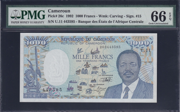 CAMEROUN-Ä«¸Þ·é-PMG66-1,000 FRANCS-#26c-1992³â