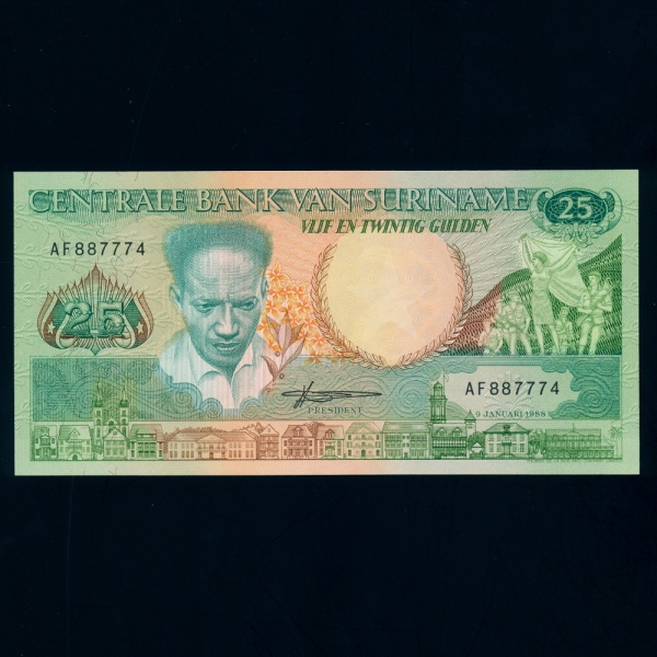 SURINAM-¼ö¸®³²-P132b-ANTON DEKOM(¾ÈÅæ µ¥ÄÞ-ÀúÀÚ)-25 GULDEN-1988³â