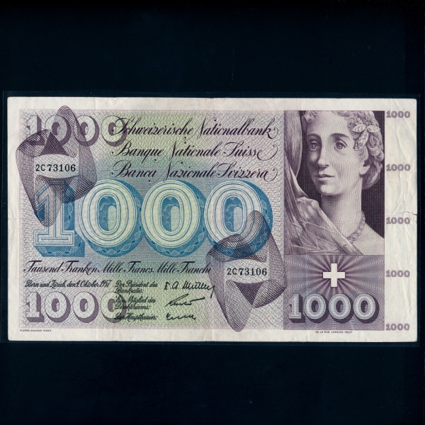 SWITZERLAND-½ºÀ§½º-P52b-1,000 FRANKEN-¿ìº¯ ¼Õ»ó-1957³â