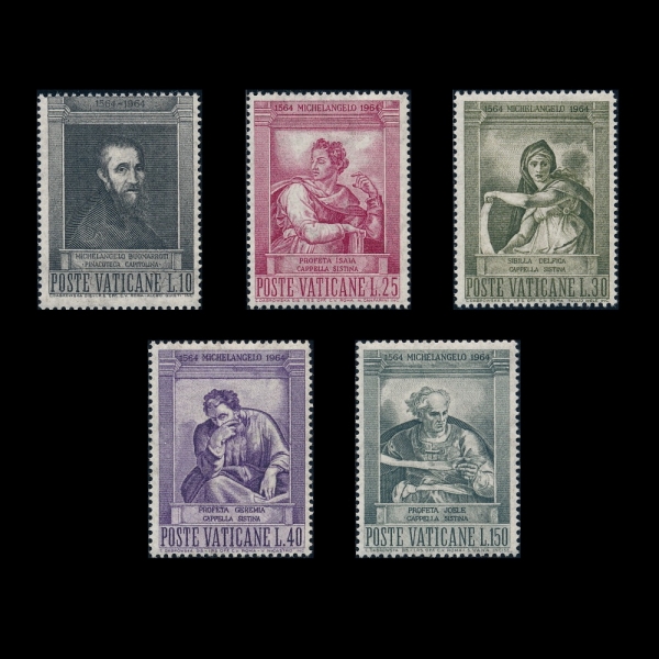 VATICAN CITY(¹ÙÆ¼Ä ½Ã±¹)-#387~91(5Á¾)-ISAISH BY MICHELANGELO(¹ÌÄ̶õÁ©·ÎÀÇ "¿¹¾ðÀÚ ÀÌ»ç¾ß")-1964.4.22ÀÏ ¹ßÇàµÈ ¹°Ç°À¸·Î ¿ÏÀü¹Ì»ç¿ë-MNH.OG ÀÔ´Ï´Ù.